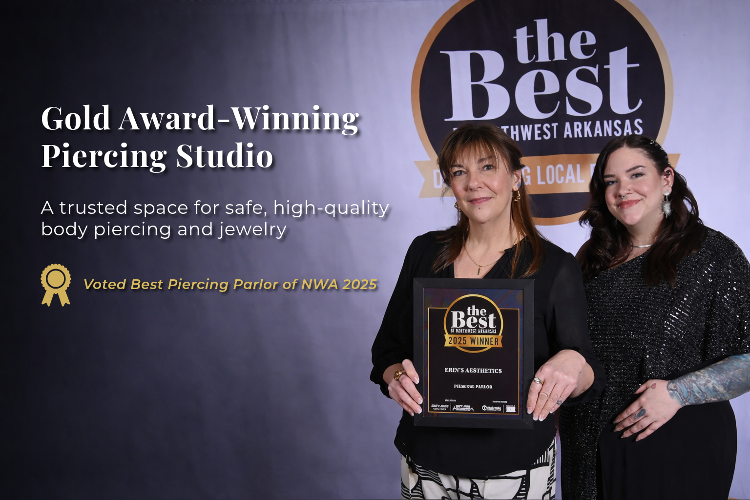 We were voted the 2025 Gold Winner for Best Piercing Parlor in Northwest Arkansas — a reflection of the trust our clients place in us and the care we bring to every appointment.