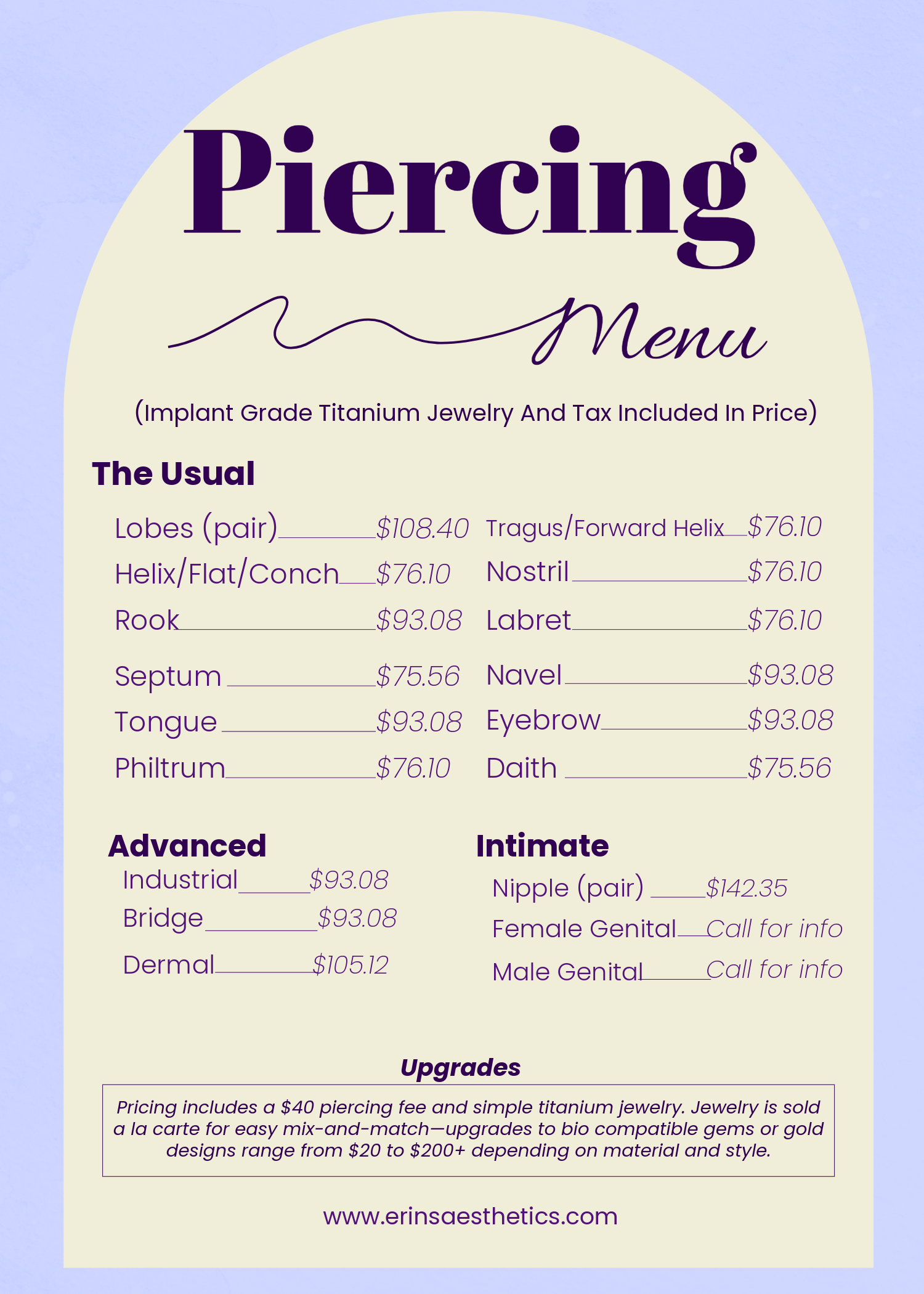 Every piercing at Erin’s Aesthetics is more than just a service — it’s a personalized experience. We offer a calm, private environment with expert placement, clear aftercare guidance, and time to find the perfect jewelry for your anatomy and style. From start to finish, your comfort and safety are our top priority.